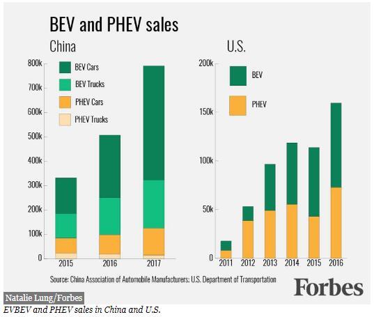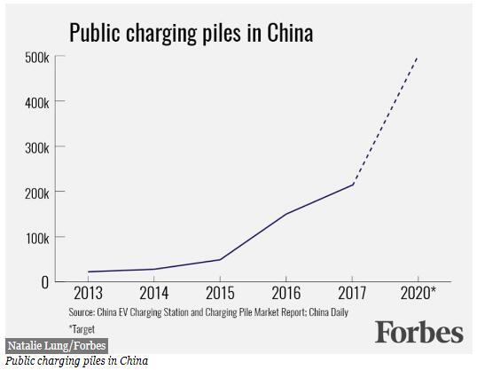 這就是中國真正領(lǐng)先的地方。它已率先開展了公共充電樁的大規(guī)模開發(fā),到2017年底已有214,000套。這些充電樁向每一個人開放,加上私人充電站就達到了232,000套。